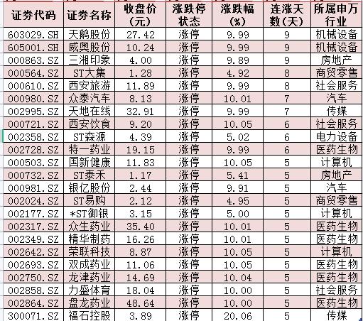 表:連續(xù)上漲5日且今日收盤(pán)漲停個(gè)股情況: