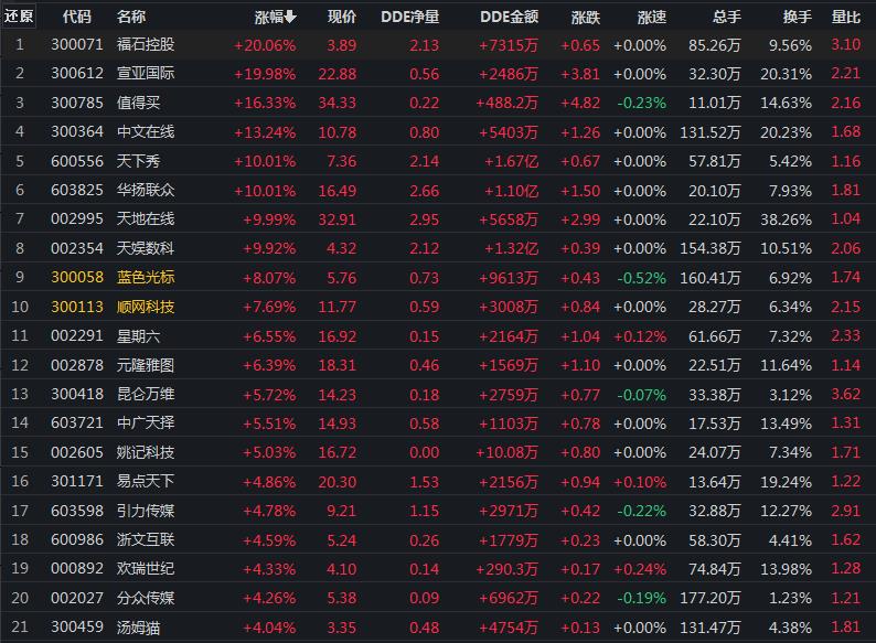 11月10日,傳媒行業(yè)漲幅居首,達(dá)2.72%。其中,天地在線、福石控股、天下秀、華揚(yáng)聯(lián)眾、天娛數(shù)科、宣亞國(guó)際6只概念股集體漲停。