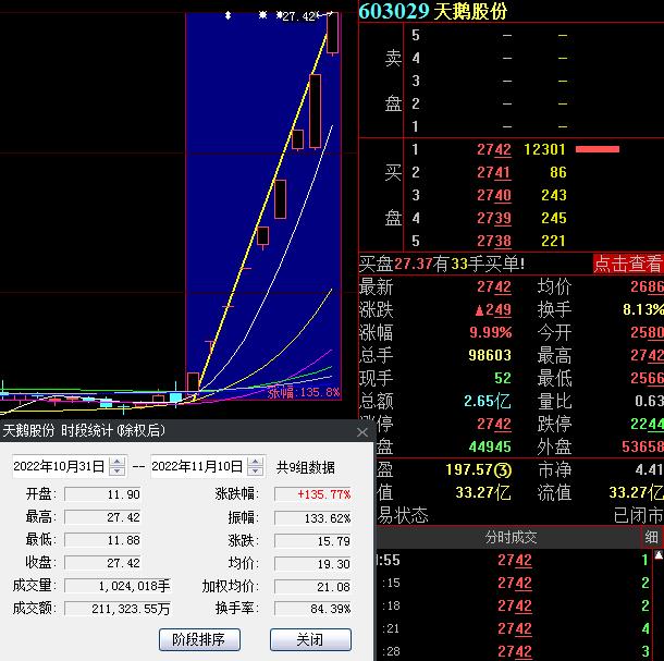 11月10日,供銷(xiāo)社概念龍頭股天鵝股份再度漲停,截至收盤(pán),報(bào)27.42元,連續(xù)9個(gè)交易日漲停,累計(jì)漲幅達(dá)135.77%。
