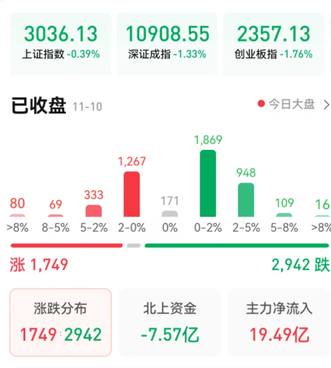 周四(11月10日),A股三大股指震蕩回落,量能依然處于萬(wàn)億元以下。截至收盤(pán),上證指數(shù)跌0.39%報(bào)3036.13點(diǎn),深證成指跌1.33%報(bào)10908.55點(diǎn),創(chuàng)業(yè)板指跌1.76%報(bào)2357.13點(diǎn);兩市合計(jì)成交8428億元,北向資金凈賣(mài)出7.57億元。總體來(lái)看,A股個(gè)股跌多漲少。
