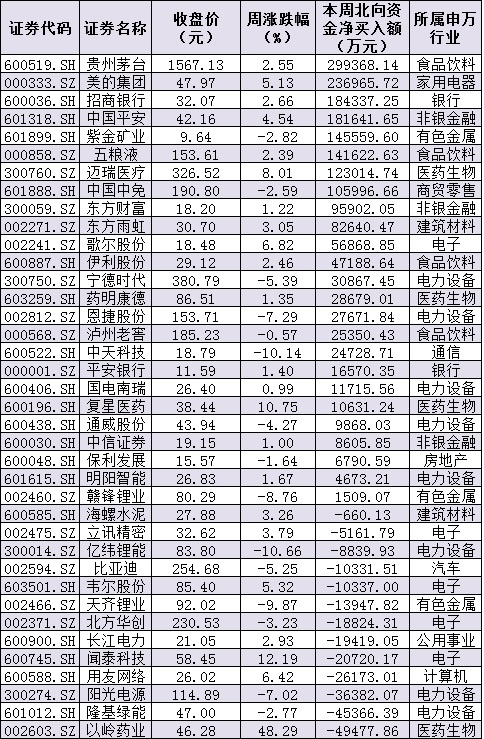 資金方面,周五,北向資金大幅凈買入金額達51.19億元,連續6個交易日實現凈買入。本周北向資金累計凈買入金額達322.83億元,為年內周凈買入次高。從前十大成交活躍股來看,本周,貴州茅臺、美的集團等2只個股,北向資金凈買入金額均超20億元。另外,以嶺藥業、隆基綠能、陽光電源等個股遭北向資金凈賣出金額均超3億元。