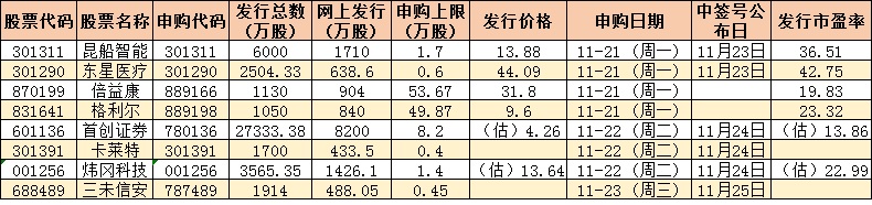 根據發行安排,下周(11月21日-11月25日)有8只新股發行,周一4只:倍益康、格利爾、昆船智能、東星醫療;周二3只:首創證券、卡萊特、煒岡科技;周三1只:三未信安。