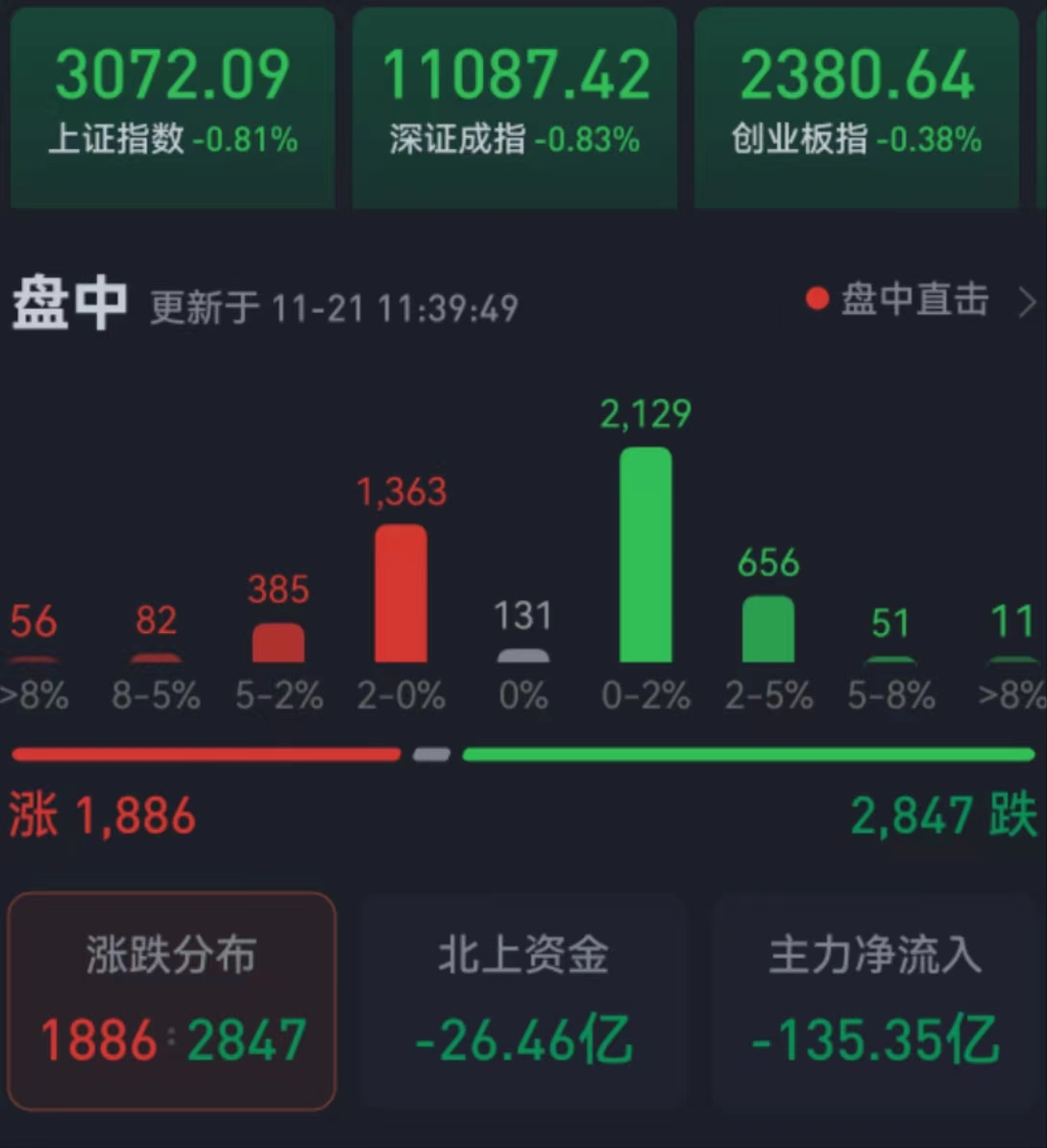 周一(11月21日),三大股指震蕩走弱,全線收綠。截至上午收盤,上證指數跌幅達0.81%,報3072.09點;深證成指和創業板指跌幅分別為0.83%和0.38%;滬深兩市合計成交額5470.8億元,總體來看,兩市個股跌多漲少。