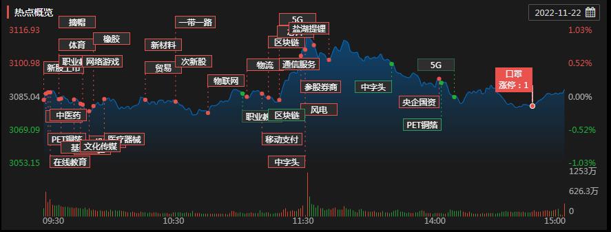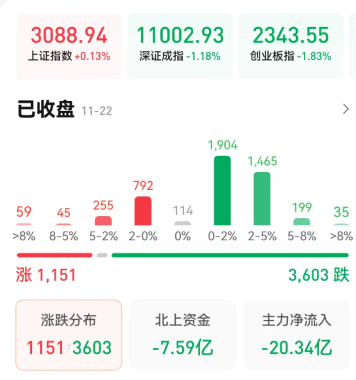 周二(11月22日)截至收盤,上證指數漲0.13%報3088.94點,深證成指跌1.18%報11002.93點,創業板指跌1.83%報2343.55點;兩市合計成交8846億元,北向資金凈賣出7.59億元。總體來看,個股跌多漲少。