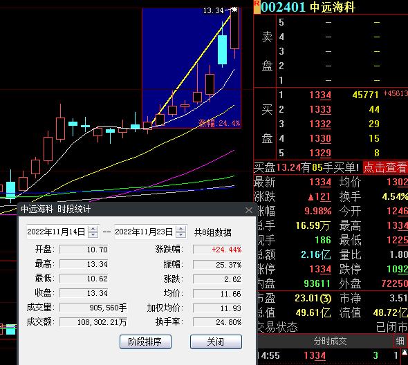 11月23日,熱門股中遠??茲q停,截至收盤報13.34元,自11月14日至今,連續8個交易日實現上漲,累計漲幅達24.44%。