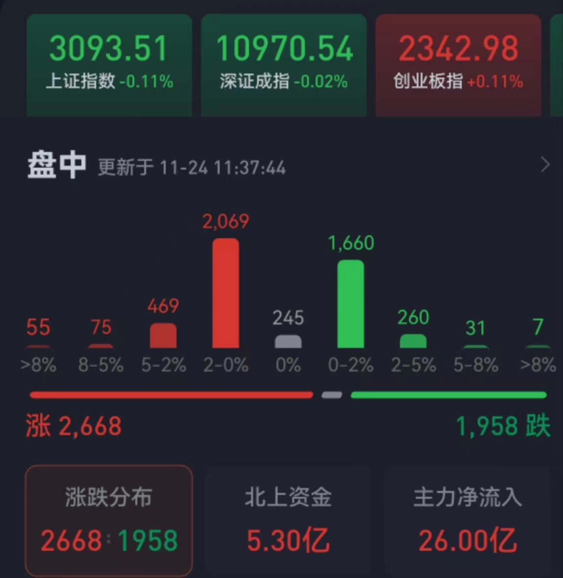 周四(11月24日),三大股指沖高后,震蕩分化,漲跌不一。截至上午收盤(pán),上證指數(shù)跌幅達(dá)0.11%,報(bào)3093.51點(diǎn);深證成指跌幅為0.02%,創(chuàng)業(yè)板指漲幅為0.11%;滬深兩市合計(jì)成交額4730.94億元,總體來(lái)看,兩市個(gè)股漲多跌少。