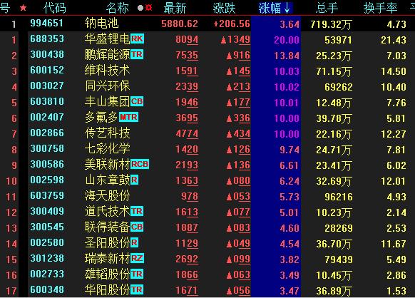 具體看,截至11月24日上午收盤(pán),鈉電池板塊漲幅居首,達(dá)3.64%。其中,華盛鋰電20CM漲停,維科技術(shù)、同興環(huán)保、豐山集團(tuán)、多氟多、傳藝科技等概念股集體漲停。