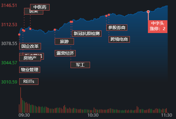 11月29日早盤,受利好消息影響,A股市場三大指數高開高走。截至上午11:30,上證指數漲2.21%,報3146.51點;深證成指和創業板指漲幅分別為2.17%和1.48%;滬深兩市合計成交額5765.1億元,較前一交易日增長15.11%。總體來看,A股市場個股呈普漲格局,有84只個股漲停,跌停股0只。