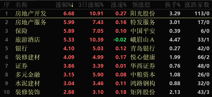 東方財富行業方面,截至11月29日11:30,86類行業中79類上漲,占比91.86%,其中,房地產開發行業漲幅居首,達6.68%,房地產服務(5.99%)、保險(5.89%)和旅游酒店(5.33%)等行業漲幅均超5%。光伏設備跌幅居首,達0.87%。