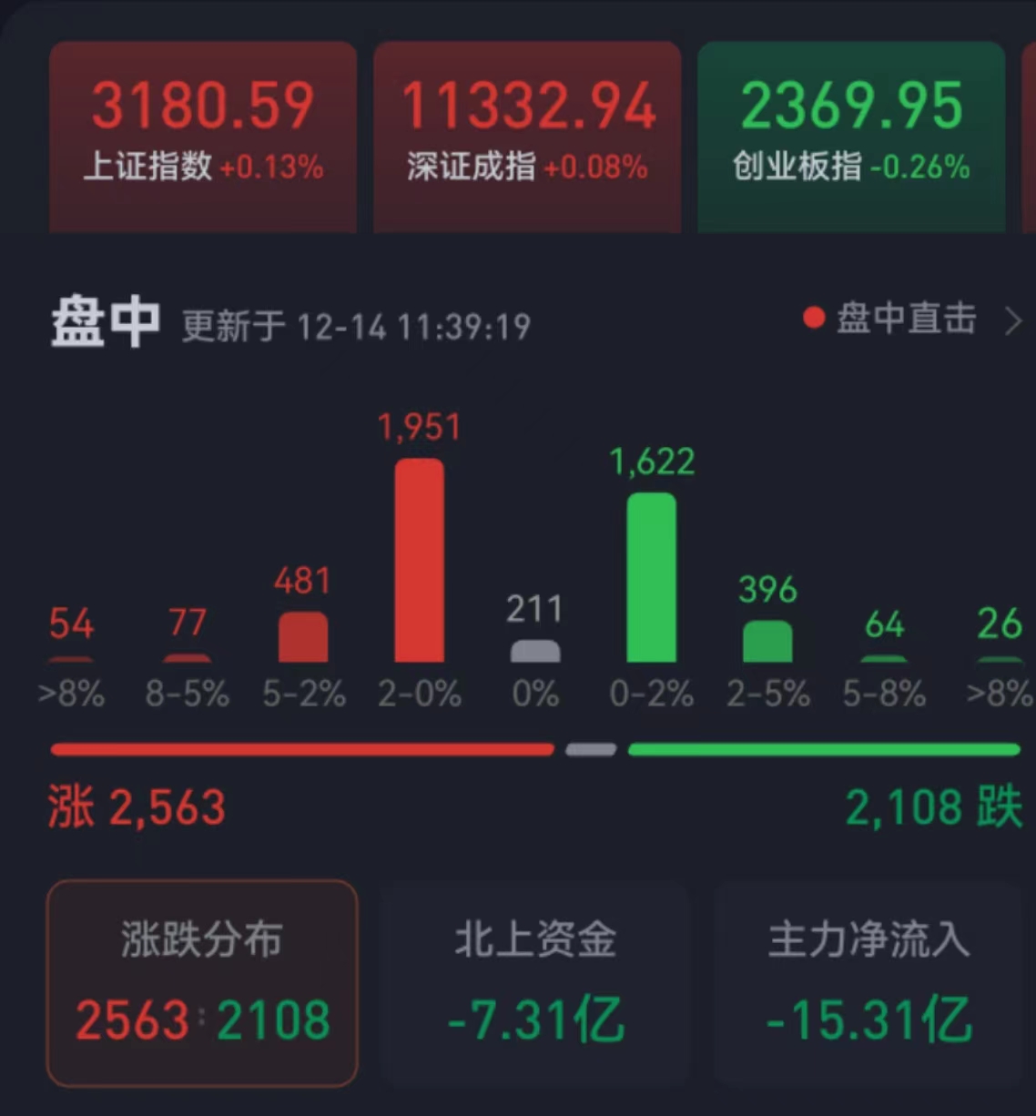 從資金面來看,12月14日上午,北向資金凈賣出金額達7.31億元。截至12月13日,滬深兩市兩融余額為15715.6億元,較前一交易日減少6.25億元。其中,融資余額為14769.42億元,較前一交易日增加0.87億元;融券余額為946.18億元,較前一交易日減少7.12億元。