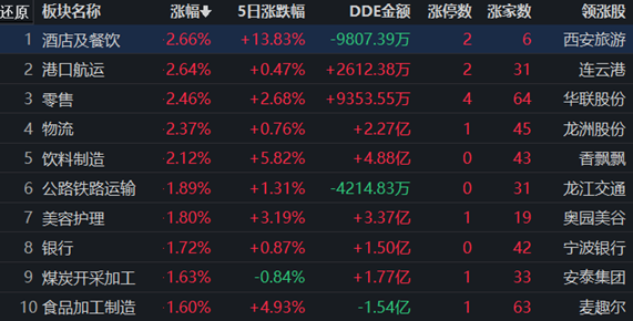 從早盤表現(xiàn)強(qiáng)勢(shì)的酒店及餐飲行業(yè)看,交易中的9只成份股有6只上漲,其中2只漲幅超5%。