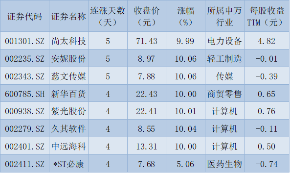 漲停股方面,今日有63只個股以漲停價報收,其中,有8只個股,股價已連續上漲超過4個交易日;跌停方面,有11只個股跌停價報收。從申萬一級行業看,輕工制造行業漲停股數量居首,達9只,緊隨其后的機械設備和房地產,漲停股數均為7只。