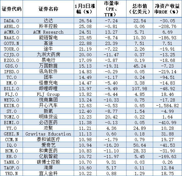 值得關注的是,在美股走低之際,中概股逆勢走高,截至1月3日收盤,納斯達克中國金龍指數漲3.76%,直播概念、網絡視頻、在線旅游等概念領漲,途牛漲幅21.19%,嗶哩嗶哩、歡聚、愛奇藝漲幅超10%。記者通過梳理各大機構研報以及對專家采訪發現,三方面因素推動中概股走強: