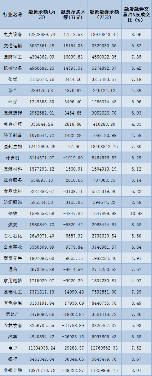 表:1月11日申萬一級行業(yè)兩融交易情況: