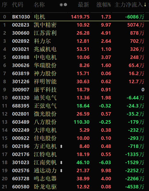 從早盤表現(xiàn)強勢的電機行業(yè)看,交易中的21只成份股有18只上漲,其中2只封漲停板。資金流向看,電機行業(yè)大單資金凈流入額為-6086萬元,居行業(yè)第34位,居首的是汽車整車行業(yè),凈流入額達7.8億元。