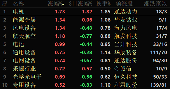 東方財富行業(yè)方面,截至1月12日11:30,86類行業(yè)中25類上漲,占比45.70%,其中,電機行業(yè)漲幅居首,達1.73%,此外,能源金屬、風(fēng)電設(shè)備和航天航空行業(yè)漲幅也超過1%。下跌方面,釀酒行業(yè)跌幅居首,達1.53%。