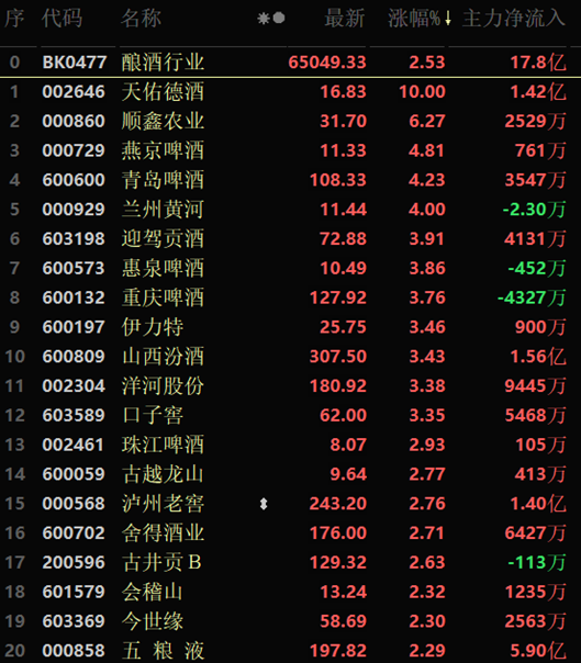 從早盤表現強勢的釀酒行業看,交易中的40只成份股全線上漲,其中有1只封漲停板。資金流向看,釀酒行業大單資金凈流入額為17.8億元,居行業第1位。