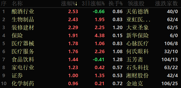 東方財富行業方面,截至1月13日11:30,86類行業中48類上漲,占比55.81%,其中,釀酒行業漲幅居首,達2.53%,此外,生物制品和裝修建材行業漲幅也超過2%。下跌方面,電源設備行業跌幅居首,達1.65%。
