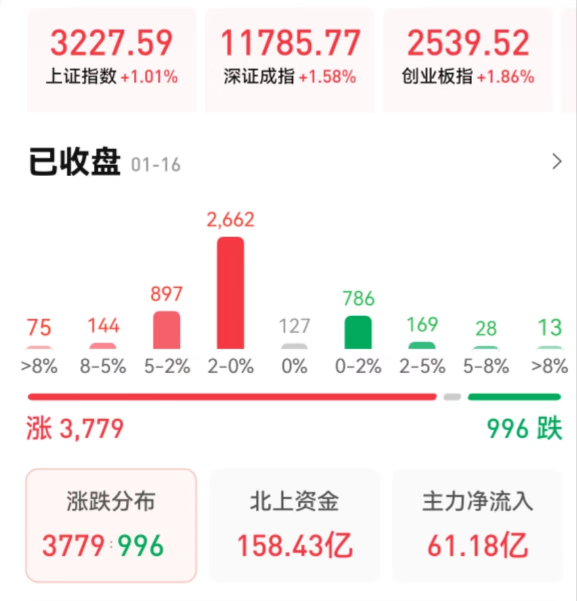 1月16日,A股市場在震蕩中放量上漲。三大股指全線上漲,滬指漲超1%,收復3200點,兩市成交額明顯放大,北向資金凈買入額超158億元。業(yè)內(nèi)人士普遍認為,A股在震蕩后將繼續(xù)揚升態(tài)勢,跨年行情或已展開。