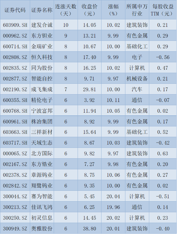 漲停股方面,今日有80只個股以漲停價報收,其中,有20只個股股價已連續上漲超過6個交易日;跌停方面,有13只個股跌停價報收。從申萬一級行業看,計算機和機械設備行業漲停股數量居首,均為10只,有色金屬和建筑裝飾緊隨其后,漲停股數均為8只。