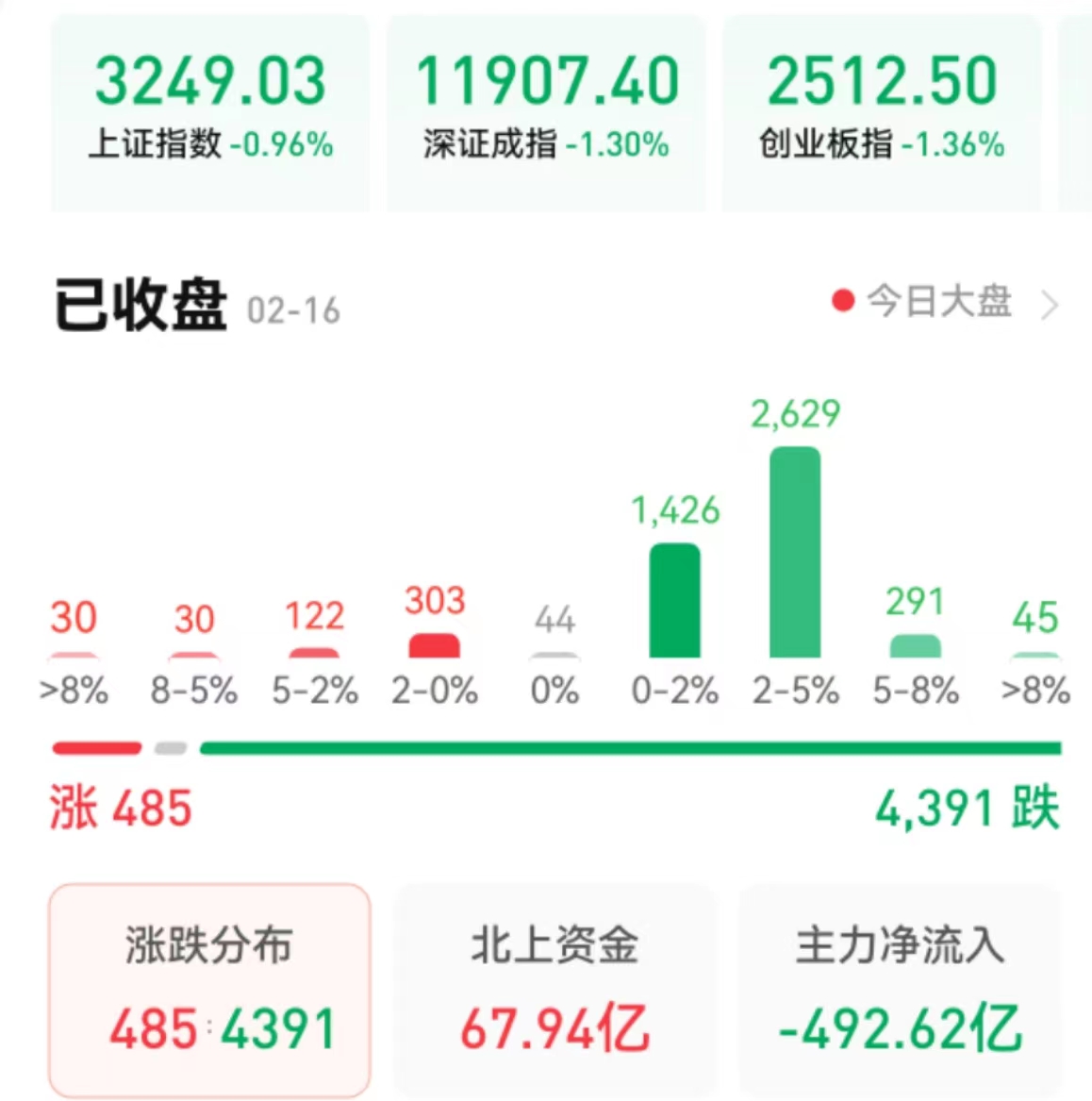 周四(2月16日),A股三大指數震蕩回落,全線下跌。截至收盤,上證指數跌0.96%報3249.03點,深證成指跌1.30%報11907.4點,創業板指跌1.36%報2512.5點;兩市合計成交金額達11930億元,自2月2日以來首次突破萬億元。北向資金凈買入67.94億元??傮w上看,兩市個股跌多漲少,近4400只個股下跌。其中,漲停個股達23只,跌停個股達4只。