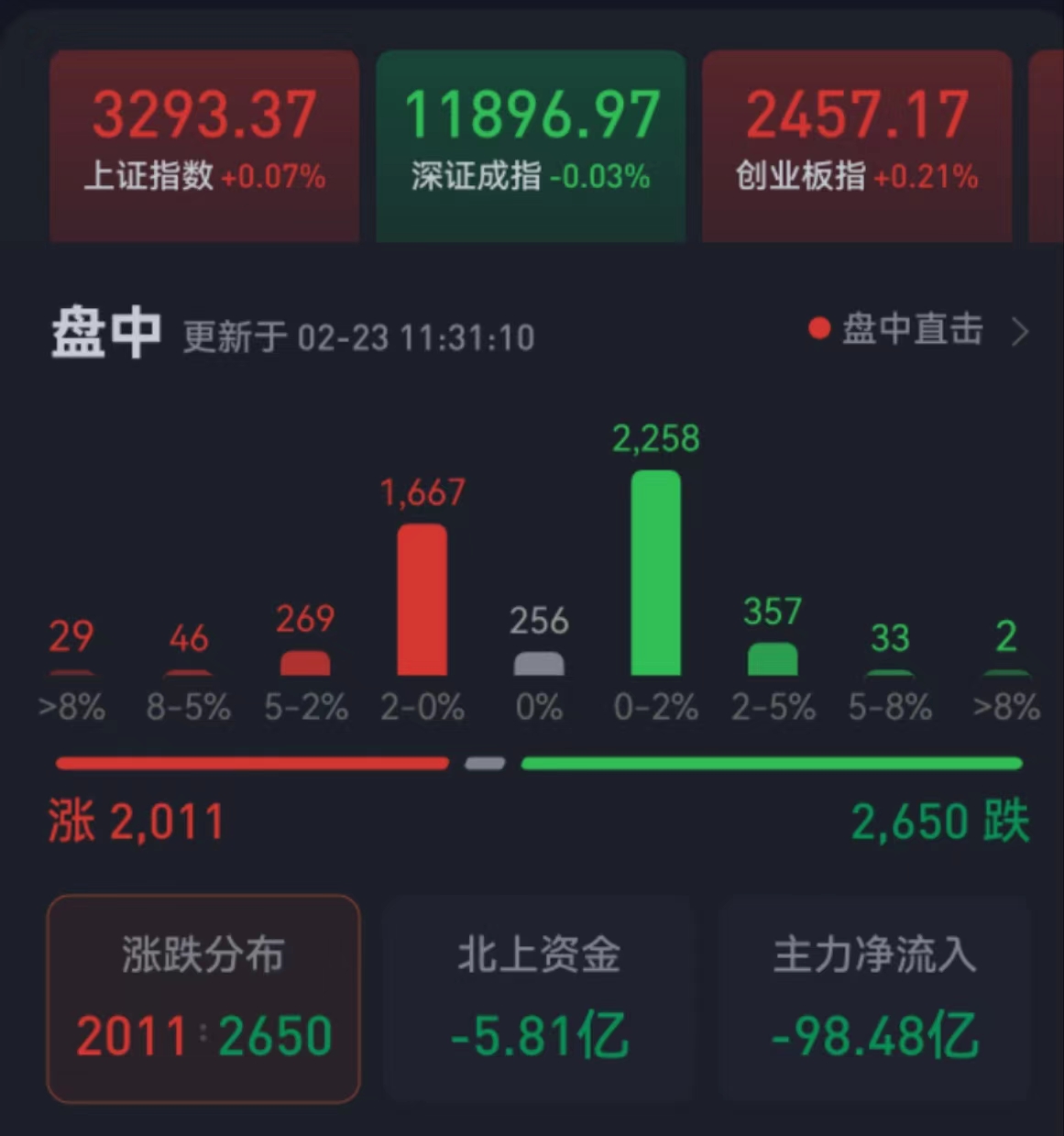 周四(2月23日),三大股指繼續(xù)震蕩分化,漲跌不一。截至上午收盤,上證指數(shù)漲幅達(dá)0.07%,報3293.37點;深證成指跌幅為0.03%,創(chuàng)業(yè)板指漲幅達(dá)0.21%;滬深兩市合計成交額4881.3億元,總體來看,兩市個股跌多漲少。