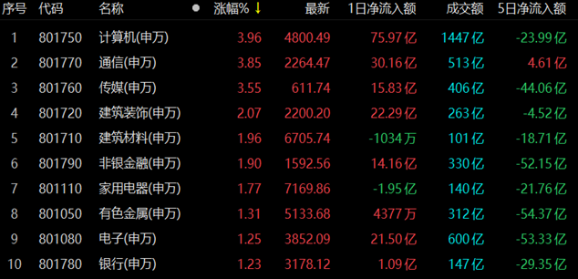 今日,A股三大指數震蕩上行,量能明顯增長,北向資金凈買入,計算機等4類申萬一級行業漲幅超2%。業內人士表示,短線多頭擁有無畏的做多底氣,有利于后續行情的演繹。