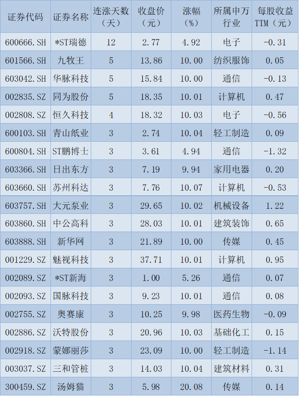 表:連續(xù)上漲3日且今日收盤漲停股一覽