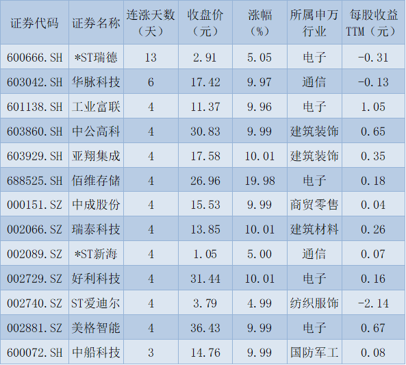 漲停股方面,今日有29只個股以漲停價報收,其中,有13只個股,股價已連續上漲超過3個交易日;跌停方面,有4只個股跌停價報收。從申萬一級行業看,電子漲停股數量居首,為8只,商貿零售緊隨其后,漲停股數為3只。