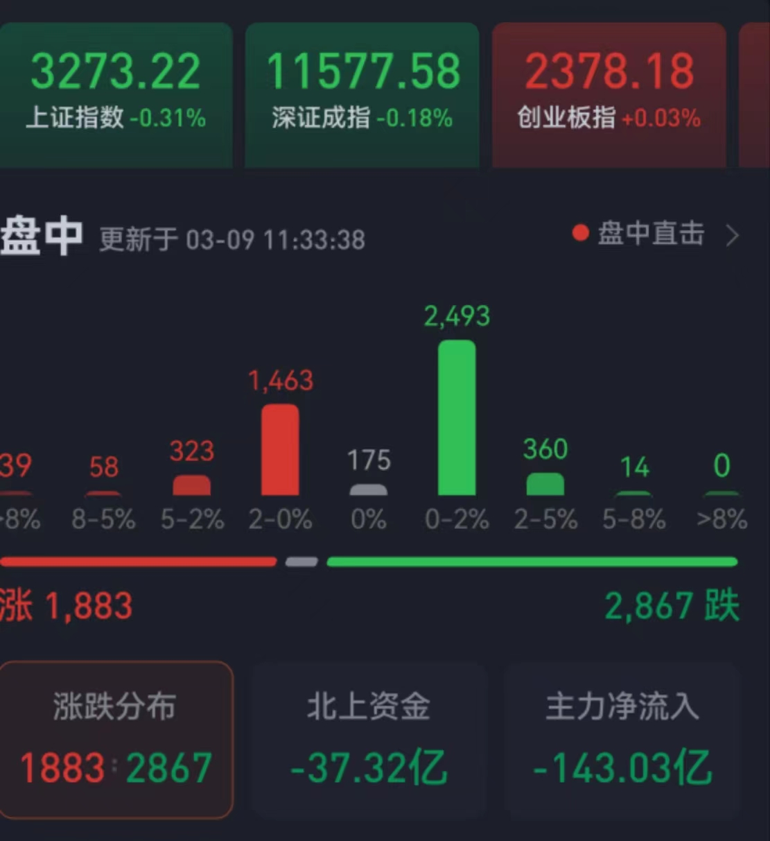 周四(3月9日),三大股指繼續震蕩分化,漲跌不一。截至上午收盤,上證指數跌幅達0.31%,報3273.22點;深證成指跌幅為0.18%,創業板指上漲0.03%;滬深兩市合計成交額4581.5億元,總體來看,兩市個股跌多漲少。