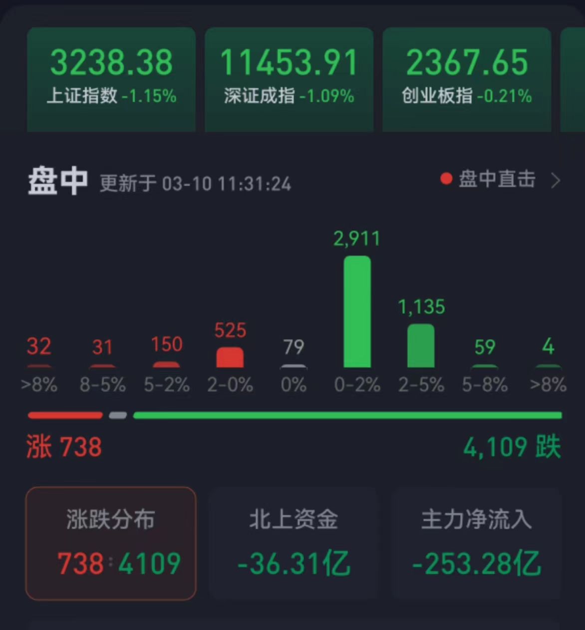 周五(3月10日),三大股指繼續震蕩回落。截至上午收盤,上證指數跌幅達1.15%,報3238.38點;深證成指跌幅為1.09%,創業板指跌幅達0.21%;滬深兩市合計成交額5127.1億元,總體來看,兩市個股跌多漲少,超4000只個股出現下跌。