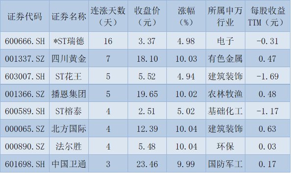 表:連續(xù)上漲3日且今日收盤漲停股一覽