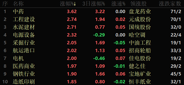 東方財富行業方面,截至3月15日11:30,86個行業板塊中77類上漲,占比89.53%,其中,中藥行業漲幅居首,達3.62%,另有包括工程建設和水泥建材等6個行業漲幅均超2%。下跌方面,計算機設備跌幅居首,達1.09%。