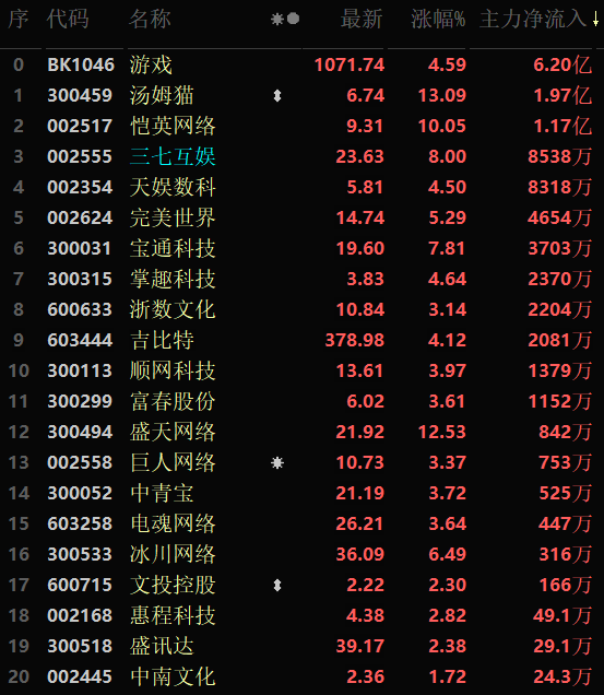 從早盤表現強勢的游戲行業看,該行業交易中的30只成分股中有29只上漲,其中,有8只個股漲幅超5%。資金方面,有6.20億元大單資金凈流入該行業,居各行業資金凈流入排名第8位。