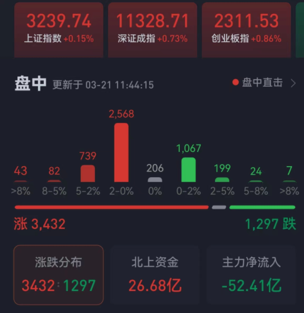 周二(3月21日),A股三大股指震蕩上漲,全線飄紅。截至上午收盤,上證指數漲幅達0.15%,報3239.74點;深證成指和創業板指漲幅分別為0.73%和0.86%;滬深兩市合計成交額5107.5億元,總體來看,兩市個股漲多跌少。