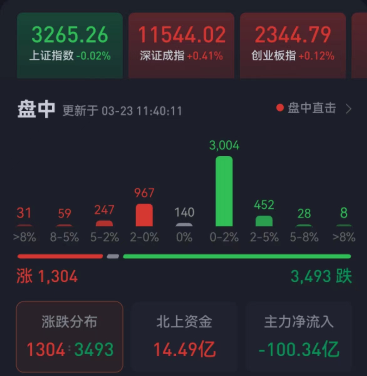 周四(3月23日),三大股指繼續震蕩分化,漲跌不一。截至上午收盤,上證指數跌幅0.02%,報3265.26點;深證成指和創業板指漲幅分別為0.41%和0.12%;滬深兩市合計成交額6040.9億元,總體來看,兩市個股跌多漲少。