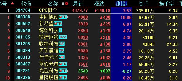具體看,截至3月23日上午收盤,CPO概念板塊再度上行,漲幅居首達3.53%。其中,中際旭創漲幅超10%。