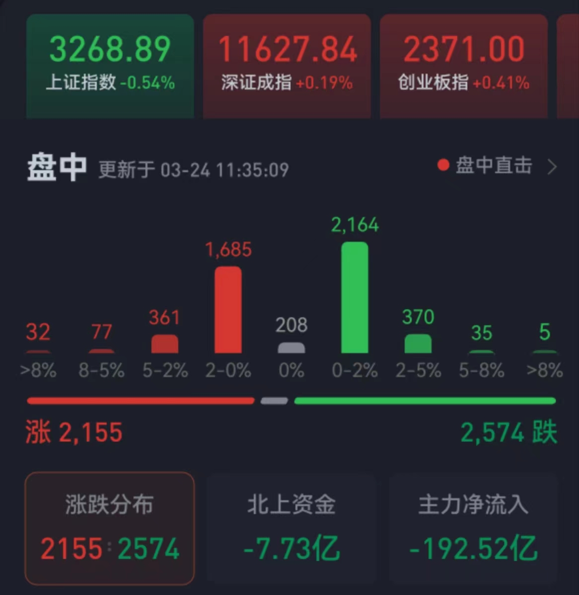 周五(3月24日),三大股指繼續震蕩分化,漲跌不一。截至上午收盤,上證指數跌幅達0.54%,報3268.89點;深證成指和創業板指漲幅分別為0.19%和0.41%;滬深兩市合計成交額6707.3億元,總體來看,兩市個股跌多漲少。