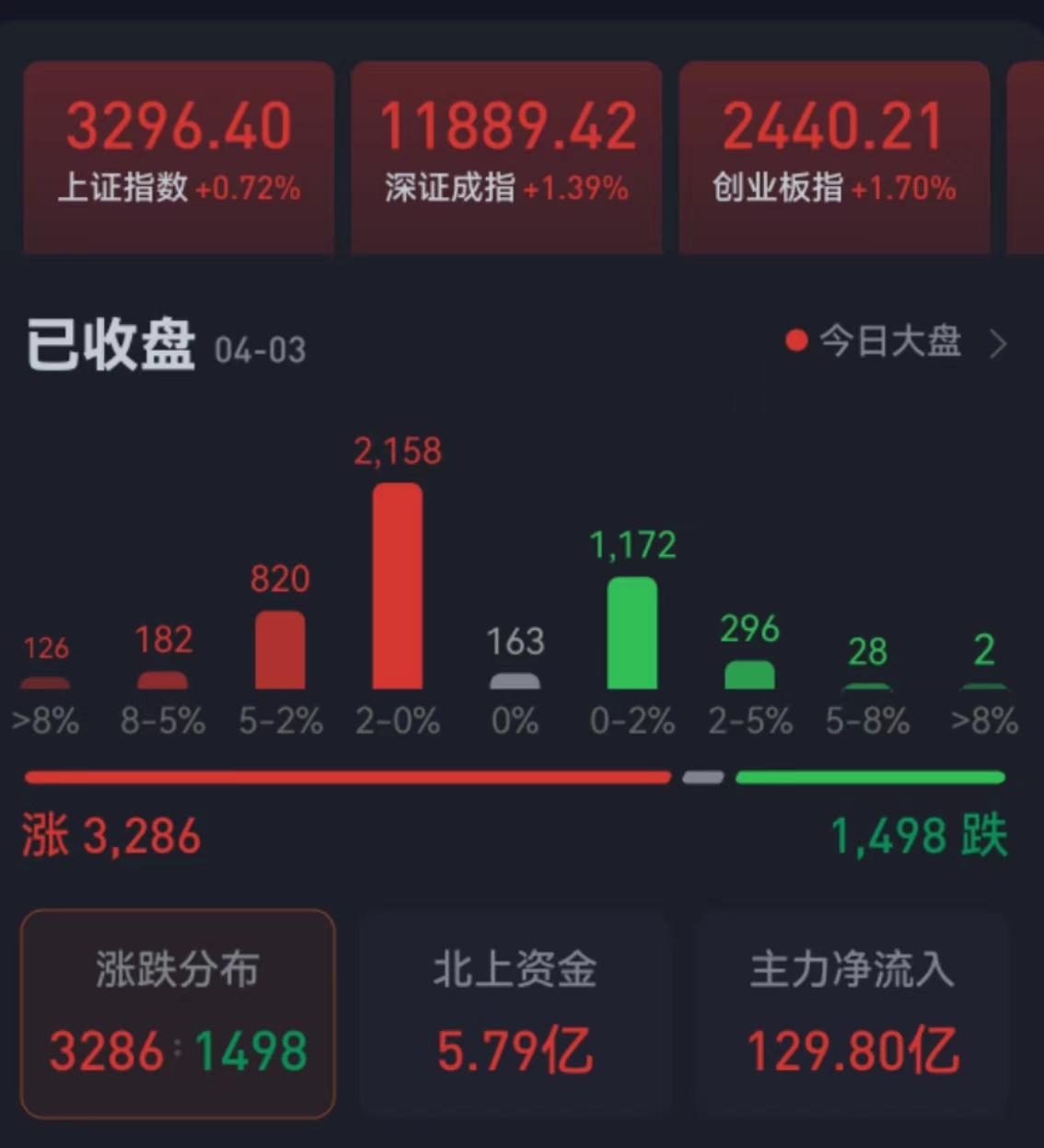 周一(4月3日),A股三大股指震蕩上行,全線飄紅。截至收盤,上證指數漲0.72%報3296.4點,深證成指漲1.39%報11889.42點,創業板指漲1.70%報2440.21點,科創50指數漲4.16%,兩市合計成交金額達12530億元,創9個月新高。北向資金凈買入5.79億元,連續5天凈買入。總體上看,A股市場個股漲多跌少,超3000只個股實現上漲,其中,漲停個股達47只,跌停個股6只。
