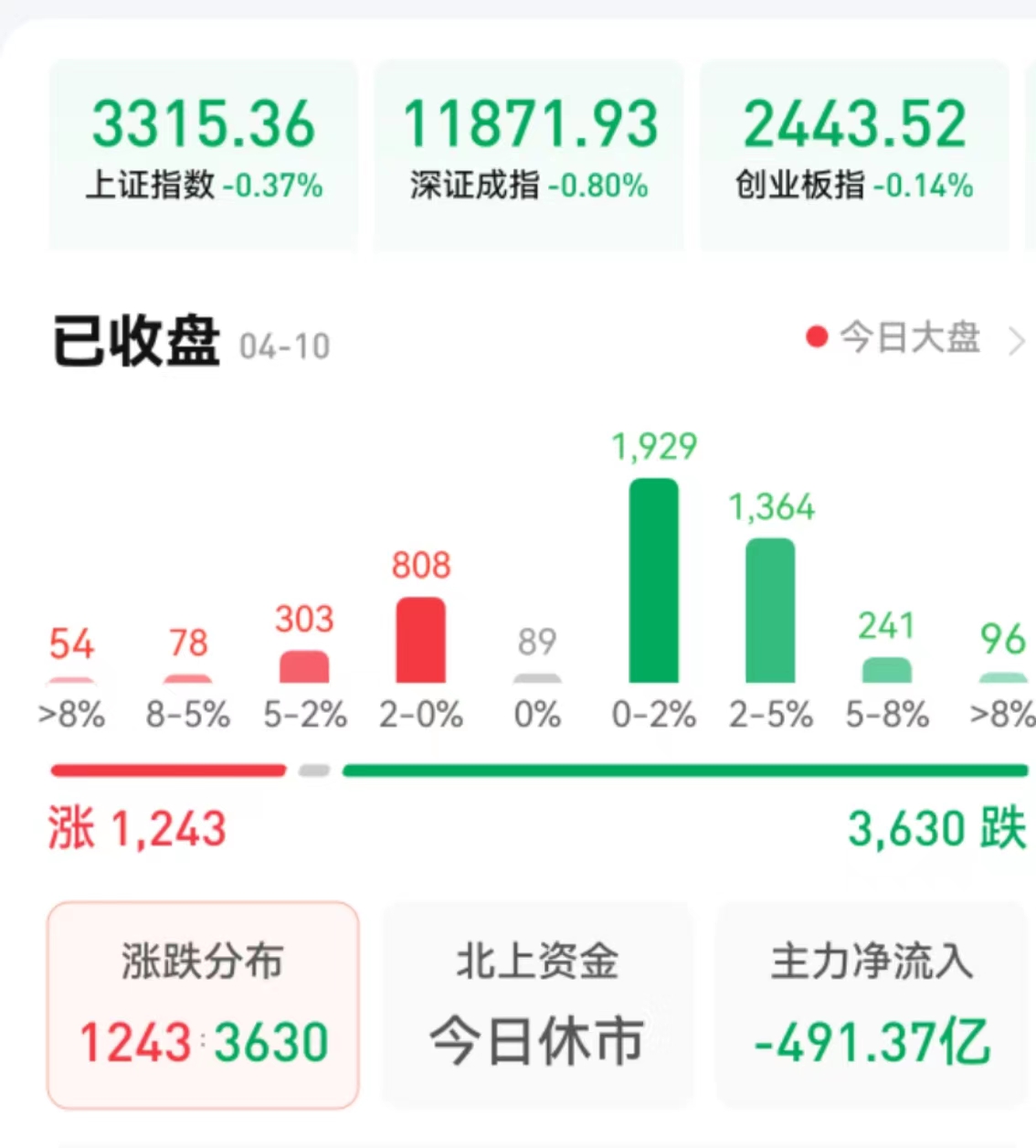 周一(4月10日),A股三大股指震蕩回落。截至收盤,上證指數跌0.37%報3315.36點,深證成指跌0.8%報11871.93點,創業板指跌0.14%報2443.52點,科創50指數跌2.74%;兩市合計成交額達12255億元,連續第五個交易日突破1萬億元。總體上看,兩市個股跌多漲少。其中,漲停個股達22只,跌停個股達25只。
