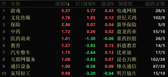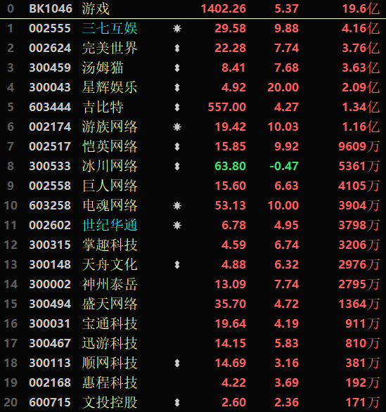 從早盤表現強勢的游戲行業看,交易中的29只成份股中26只上漲,其中,有13只個股漲幅超5%。資金方面,有19.6億元大單資金凈流入該行業,居各行業第1位。