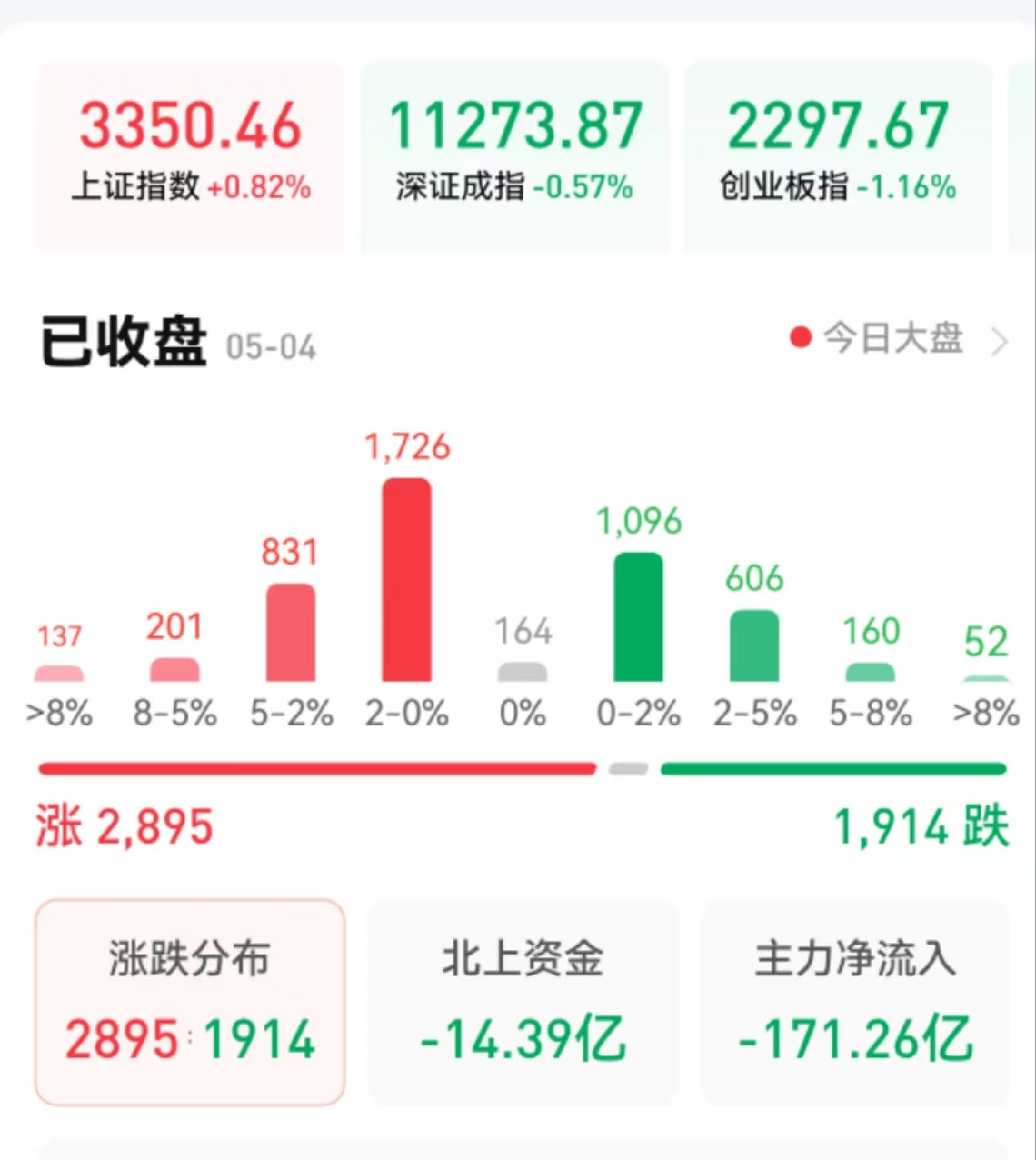 周四(5月4日),A股三大股指震蕩分化,漲跌不一。截至收盤,上證指數漲0.82%報3350.46點,深證成指跌0.57%報11273.87點,創業板指跌1.16%報2297.67點;兩市合計成交額達11717億元,連續第20個交易日突破萬億元;北向資金凈賣出14.39億元。總體上看,兩市個股漲多跌少。其中,漲停個股達102只,跌停個股達30只。