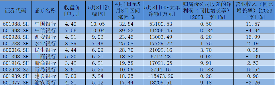 表:5月8日,銀行行業漲幅超5%個股一覽