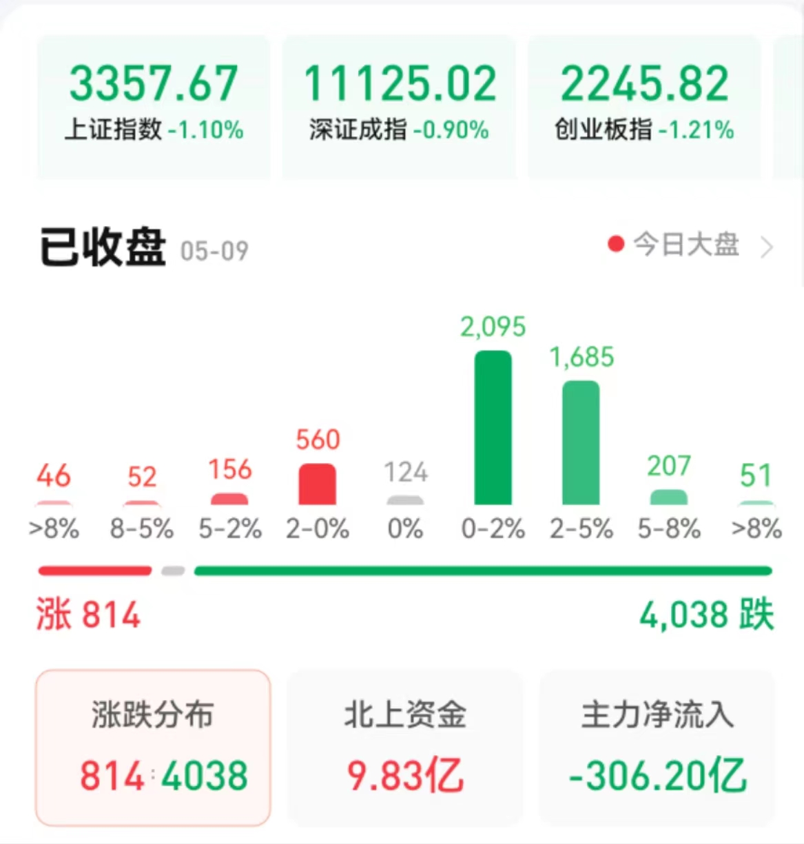 周二(5月9日),A股三大股指震蕩回落,全線下跌。截至收盤,上證指數跌1.1%報3357.67點,深證成指跌0.90%報11125.02點,創業板指跌1.21%報2245.82點;兩市合計成交金額12218億元,連續第23個交易日突破萬億元,北向資金凈買入9.83億元。總體上看,兩市個股跌多漲少,超4000只個股下跌。其中,漲停個股達24只,跌停個股達72只。
