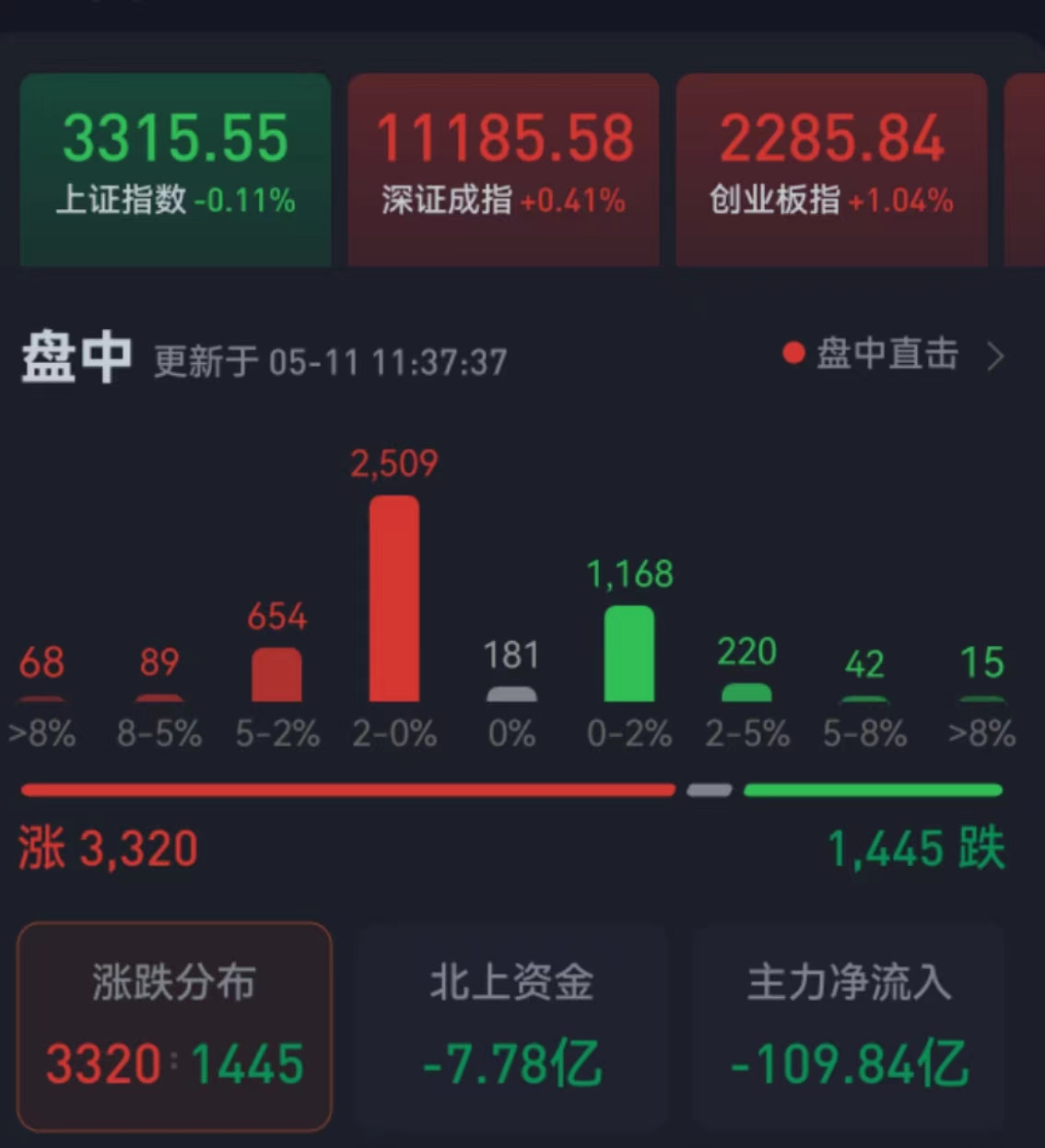 周四(5月11日),三大股指震蕩分化,漲跌不一。截至上午收盤,上證指數(shù)跌0.11%,報3315.55點;深證成指漲0.41%,創(chuàng)業(yè)板指漲幅為1.04%;滬深兩市合計成交額5829.2億元,總體來看,兩市個股漲多跌少。