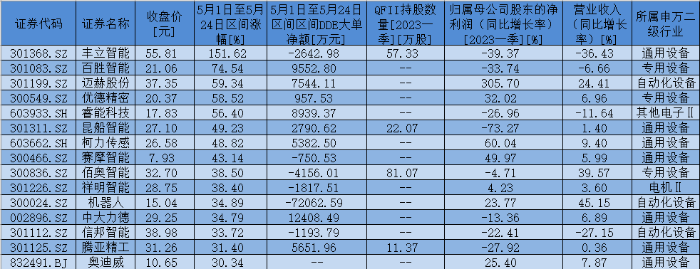 表:5月1日至5月24日,機器人概念板塊區間漲幅超30%個股一覽