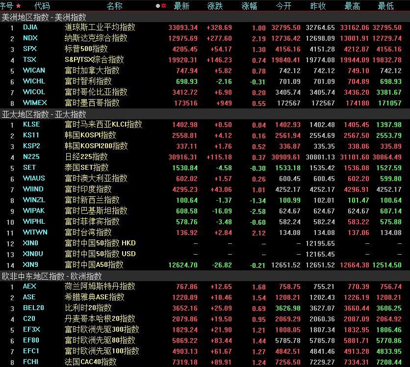 周五,美國(guó)三大股指全線收漲,道指漲1%報(bào)33093.34點(diǎn),標(biāo)普500指數(shù)漲1.3%報(bào)4205.45點(diǎn),納指漲2.19%報(bào)12975.69點(diǎn)。本周,道指跌1%,標(biāo)普500指數(shù)漲0.32%,納指漲2.51%。
