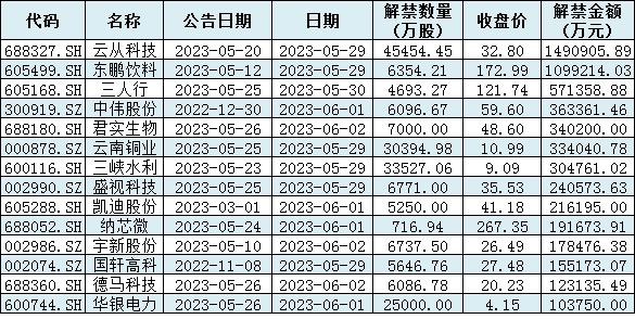 與此同時(shí),統(tǒng)計(jì)顯示,下周(5月29日-6月2日)共有75家公司限售股陸續(xù)解禁,按最新收盤價(jià)計(jì)算,解禁市值為627.95億元。從解禁市值來(lái)看,云從科技-UW(149.09億元)、東鵬飲料(109.92億元)等公司解禁金額均超100億元。