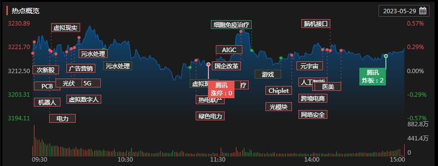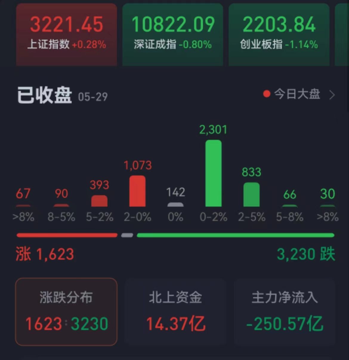 周一(5月29日),A股三大股指震蕩分化,漲跌不一。截至收盤,上證指數漲0.28%報3221.45點,深證成指跌0.80%報10822.09點,創業板指跌1.14%報2203.84點;兩市合計成交9208億元,北向資金凈買入額達14.37億元??傮w上看,兩市個股漲少跌多。其中,漲停個股達41只,跌停個股達43只。