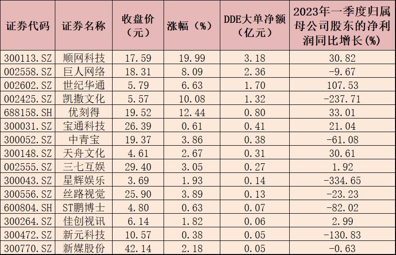 表:5月29日獲得大單資金凈買入的云游戲概念股一覽